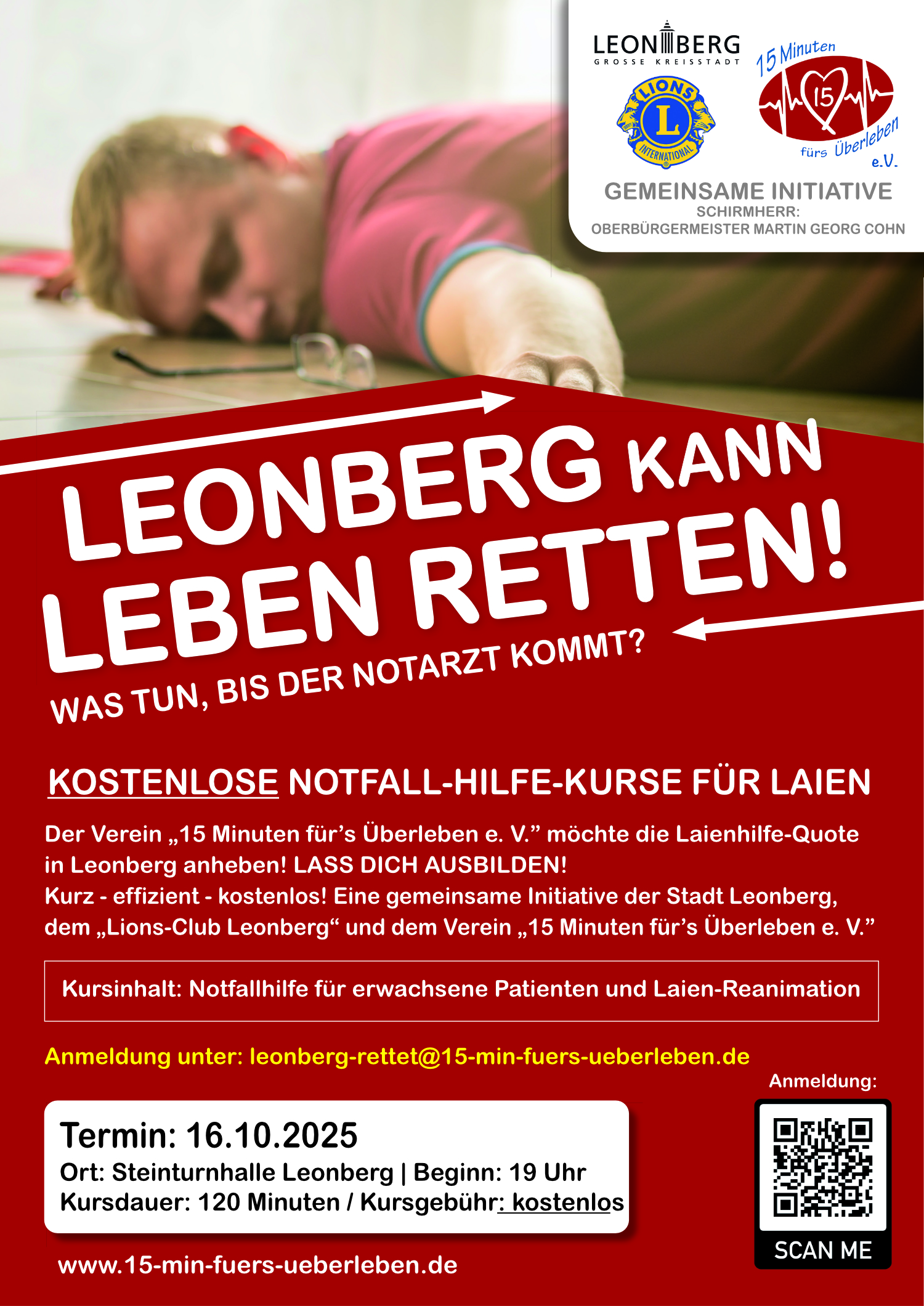 Leonberg startet in eine neue Ausbildungsrunde. Der LIONS-Club Leonberg möchte auch in diesem Jahr wieder mit uns zusammen die Laienreanimationsquote in Leonberg erhöhen. Termin: 16.10.2025 Ort: Steinturnhalle Leonberg | Beginn: 19 Uhr Kursdauer: 120 Minuten / Kursgebühr: kostenlos Ähnliche Beiträge