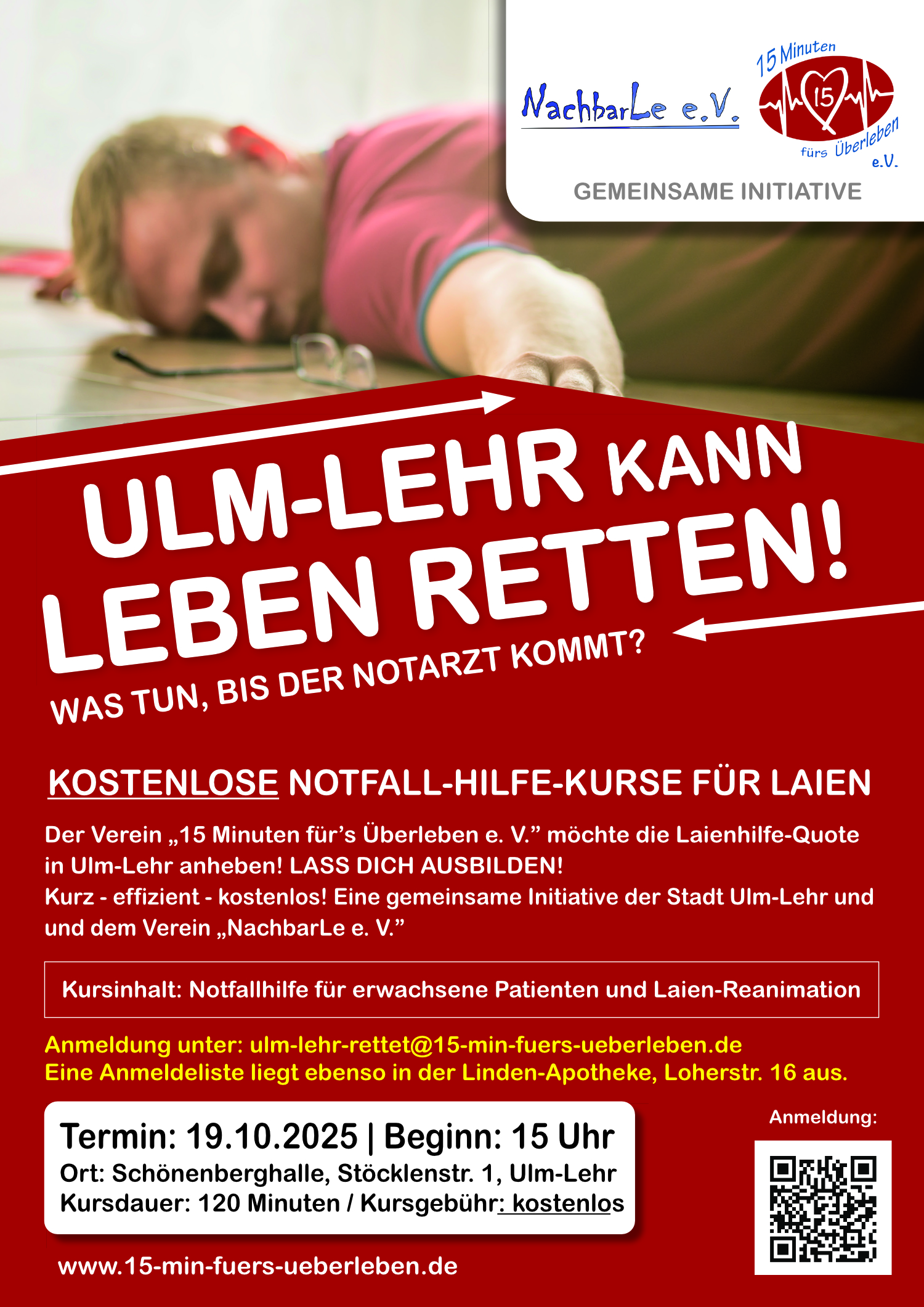 Ulm-Lehr startet in eine neue Ausbildungrunde! Der Verein NachbarLe e.V. möchte auch in diesem Jahr wieder mit uns die Laienreanimationsrate in Ulm-Lehr erhöhen: Termin: 19.10.2025 | Beginn: 15 Uhr Ort: Schönenberghalle, Stöcklenstr. 1, Ulm-Lehr Kursdauer: 120 Minuten / Kursgebühr: kostenlos Ähnliche Beiträge
